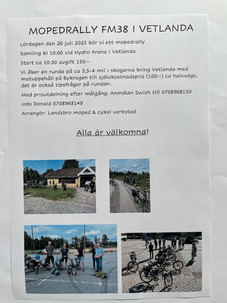 26 juli Mopedrally FM38 i Vetlanda Publicerat avBengt Ejenmarkjuni 22, 2025juni 23, 2025Publicerad iJuli 2025, Utan datum Datum: 26 juli kl 10.00Plats: Hydro Arena i Vetlanda. Start ca 10:30. Avgift 150:- .Anmälan: Swish till 0708968150Info: Donald 0708968149 Gilla Laddar in … Relaterade